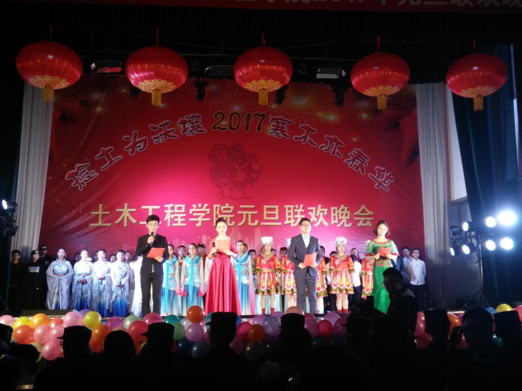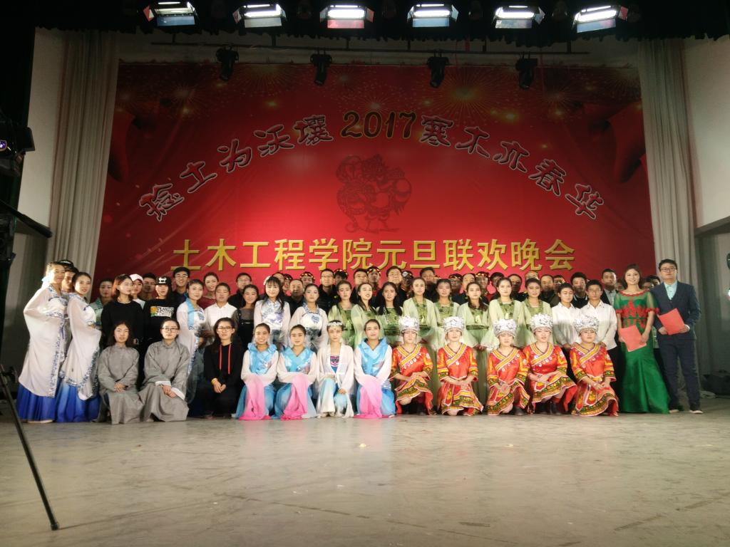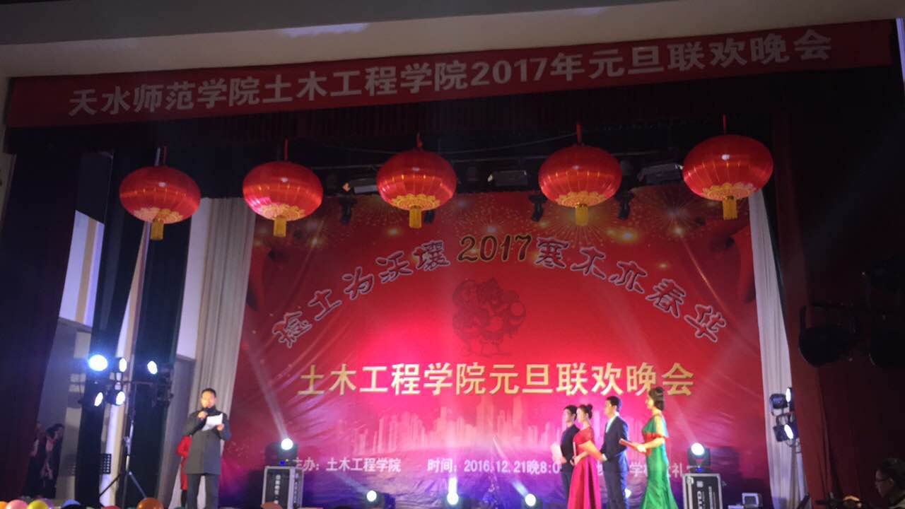 12月21号晚八点整,土木工程学院“捻土为沃壤·寒木亦春华”为主题的2017元旦晚会在校大礼堂隆重举行,学校党委宣传部部长汪咏国,教育学院副书记赵向东,天水市建筑工程造价站站长左朝辉,天水嘉通建设集团总经理牛小明,天水永生建设集团总经理张明乐,天水昊辰建设集团总经理刘钰辉,天水中宏监理公司总经理郑春生,甘肃省城乡工业设计院天水分公司经理孙万友,天水嘉通建设集团总工程师何换平,土木工程学院直属党支部书记南喜涛、院长杨帆、副院长吕向明及土木工程学院全体老师出席本次晚会。