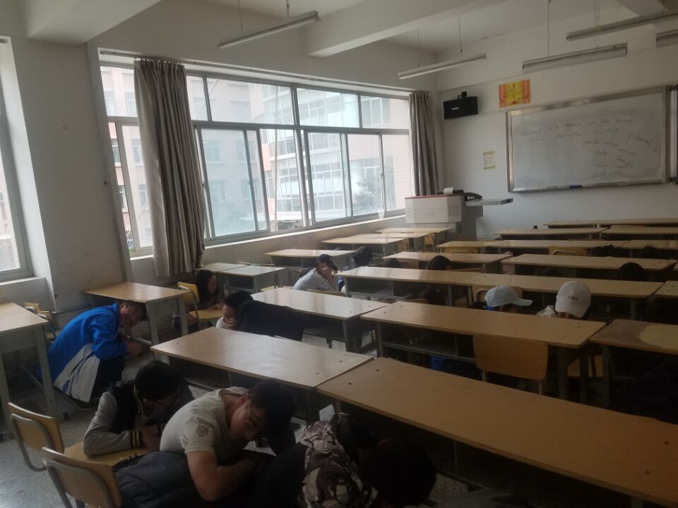 演练分为两个阶段:教室内应急避震阶段和紧急疏散阶段。第一个阶段里,由班主任向同学详细描述在教室里避险的正确姿势和逃生的正确方法,当信号员发出“地震警报”的哨声后,教室里的每个人都迅速抱头、闭眼,躲在各自的课桌旁,尽量蜷曲身体,大约1分钟后,强震过去,进入紧急疏散阶段;哨声信号再次响起时所有同学们在班主任的指挥下双手抱头弯腰撤出教室,沿走廊和楼梯的墙根有秩序向下撤离,按照预定的疏散路线,迅速的撤离到指定的地点整队,清点人数,检查是否有人被困于楼中。