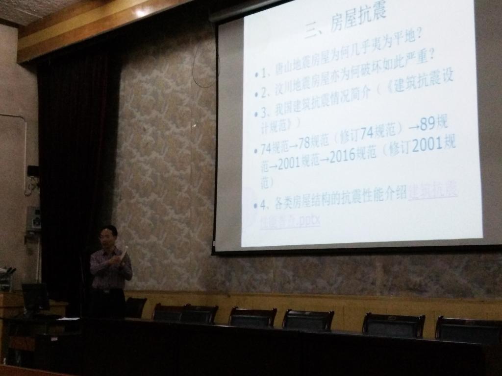 随后,南书记又结合土木工程专业就房屋的结构和抗震的关系作了生动而细致的讲解。南书记指出现代建筑结构形式主要有砖混结构、框架结构、钢结构、土木结构、框架剪力墙结构等,无论哪一种结构,只要设计合理,高度与结构形式相匹配,具有柱和框架的支撑,就应该是抗震的。南书记的讲解声情并茂,在抗震问题中又穿插着专业知识,一举两得。