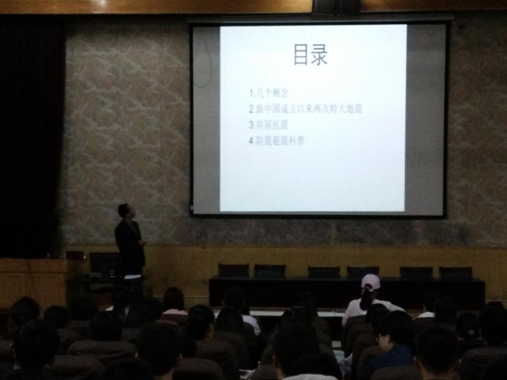 讲座在晚上19:30开始。首先,南书记就地震的成因以及分类做了简短的介绍,使同学们对地震有了更加清楚地认识。接着,南书记结合1976年唐山大地震和2008年汶川大地震的惨痛实例,深入浅出,利用视屏、图片等多媒体,图文并茂的为学生讲明了防震减灾的重要性,并重点讲解了应急避险、在不同场所遇难时自救互救等有关知识。