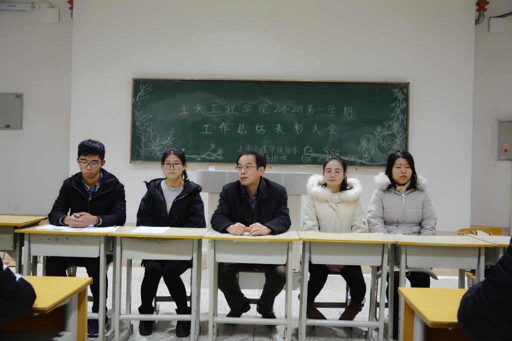 2019年1月4日下午,土木工程学院在4教101教室召开了2018-2019学年第一学期工作总结暨表彰大会。出席会议的有我院直属党支部书记张建宏,团委书记周姣、辅导员赵丹、孙艳以及学生会全体成员和五星级文明宿舍代表。