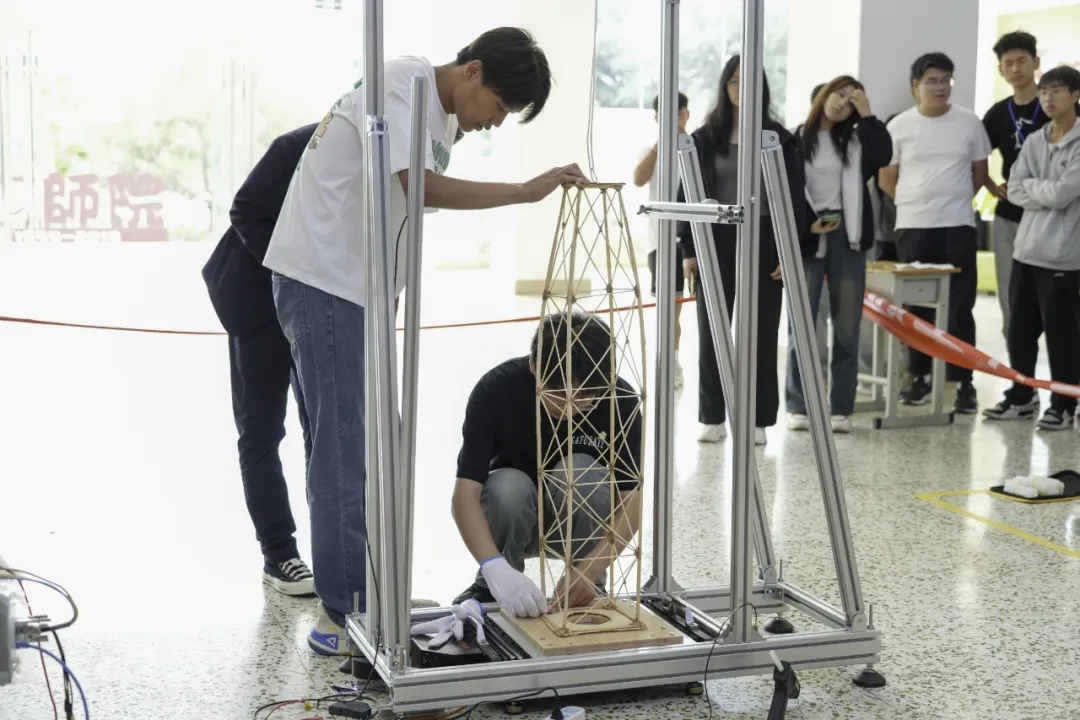 第二阶段为加载,比赛队伍需要在模型尺寸图的基础上,进行详尽的震动分析和评估,确保结构在模拟加载过程中的稳定性。这一环节不仅考验了参赛者对结构力学的理解,也考察了他们对刚度、强度和稳定性的综合应用能力。短短的几分钟加载过程扣人心弦,当倒计时开始,加载现场的所有目光都将独属正在加载的模型。