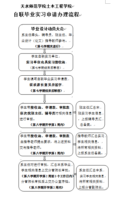 第七学期末由系主任牵头,辅导员、班主任、毕业设计(论文)指导教师参与,对学生召开一次毕业设计动员会,学习“土木工程学院自联毕业实习管理办法”和“实习安全协议书”,并告知办理自联实习审批的程序及所需提供材料。