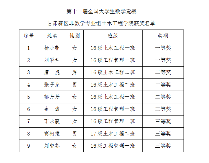 2019年11月11日,第十一届全国大学生数学竞赛(甘肃赛区)获奖名单公布,土木工程学院学生在比赛中再创佳绩。本届数学竞赛中我校非数学专业组共18人获奖,我院9人获奖,其中一等奖2人,二等奖3人,三等奖4人。