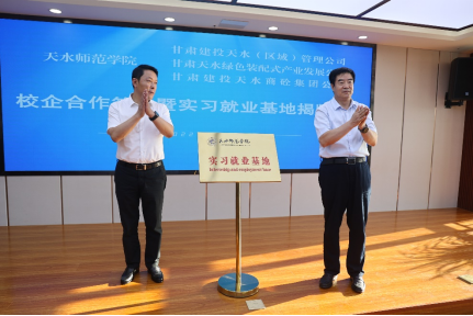 汪聚应一行先后参观了天水装配式建筑产业园PC(装配式混凝土结构)和PS(装配式钢结构)车间、天水体育中心等重点项目。随后双方就人才培养、校企合作等相关事宜进行了深入交流和座谈。汪聚应对学校的办学历史、办学条件、办学目标、德赢vwinac米兰官网登录、人才培养、学科专业建设及校企合作等方面作了介绍,各部门负责人针对各自关心的校企合作问题与企业进行了深入交流。校长汪聚应希望在校企合作共赢的基础上,实现学校高质量内涵式发展,双方能够围绕人才培养、专业建设、“双师型”德赢vwinac米兰官网登录建设、科学研究、成果转化、实习就业一体化等方面开展深度合作。甘肃建投天水(区域)管理公司董事长充分肯定了长期以来学校在人才培养方面做出的重大贡献,就单位的发展现状、企业理念、人才需求等作了详细介绍,着重从校企合作方向、联合培养、实习就业等方面作出具体说明,并表示将与学校建立长期合作关系,推动校企共赢发展。随后,王军与校长汪聚应分别代表校企双方签署合作协议,并一同为天水师范学院“实习就业基地”揭牌。