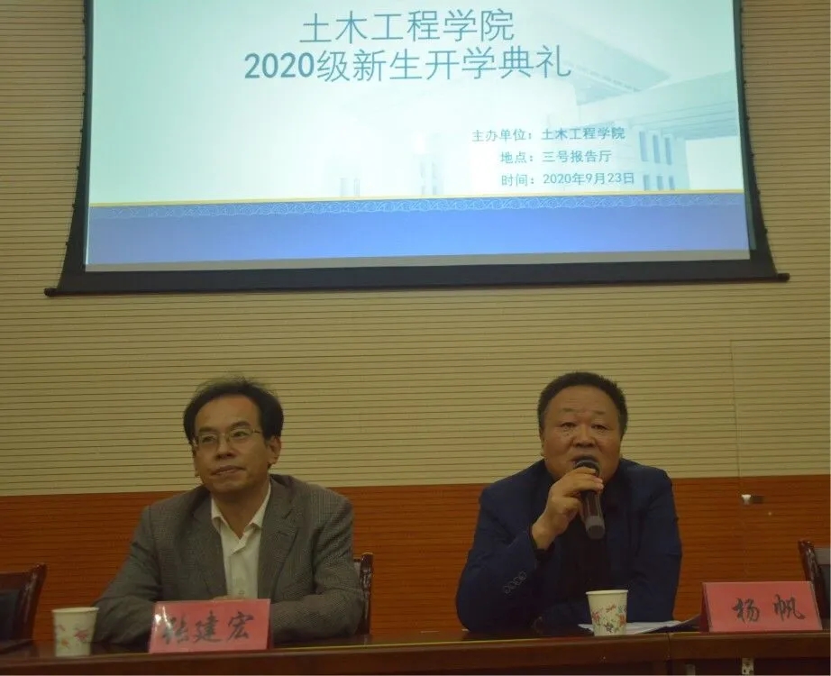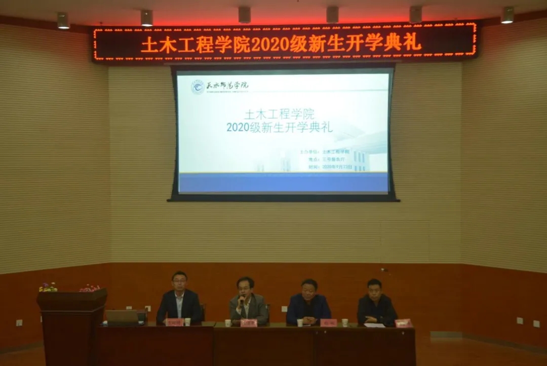 2020年9月23日晚上,我院在学校三号报告厅隆重召开了2020级新生开学典礼。土木工程学院直属党支部书记张建宏、院长杨帆、副院长张自福、吕向明,辅导员魏伟、高茜、孙艳,新生班主任朱丹丹、蒋天娇以及2020级全体新生200余人出席此次入学典礼,大会由副院长张自福主持。