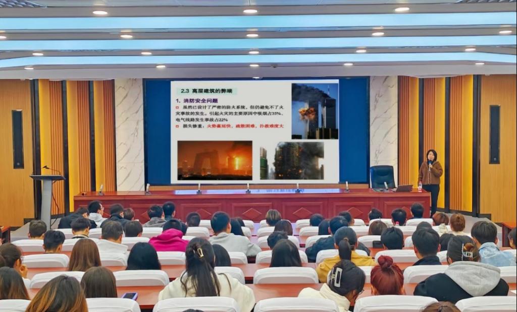 张硕英副教授深度剖析了高层建筑结构的发展历程和存在的问题,围绕高层建筑结构受力特点、结构体系及材料类型等关键技术做了详细阐述。就未来高层建筑的绿色化、低碳化、信息化、数字化以及建筑工业化等方面做了探讨,并在报告后与师生就高层建筑未来发展进热烈交流和探讨。