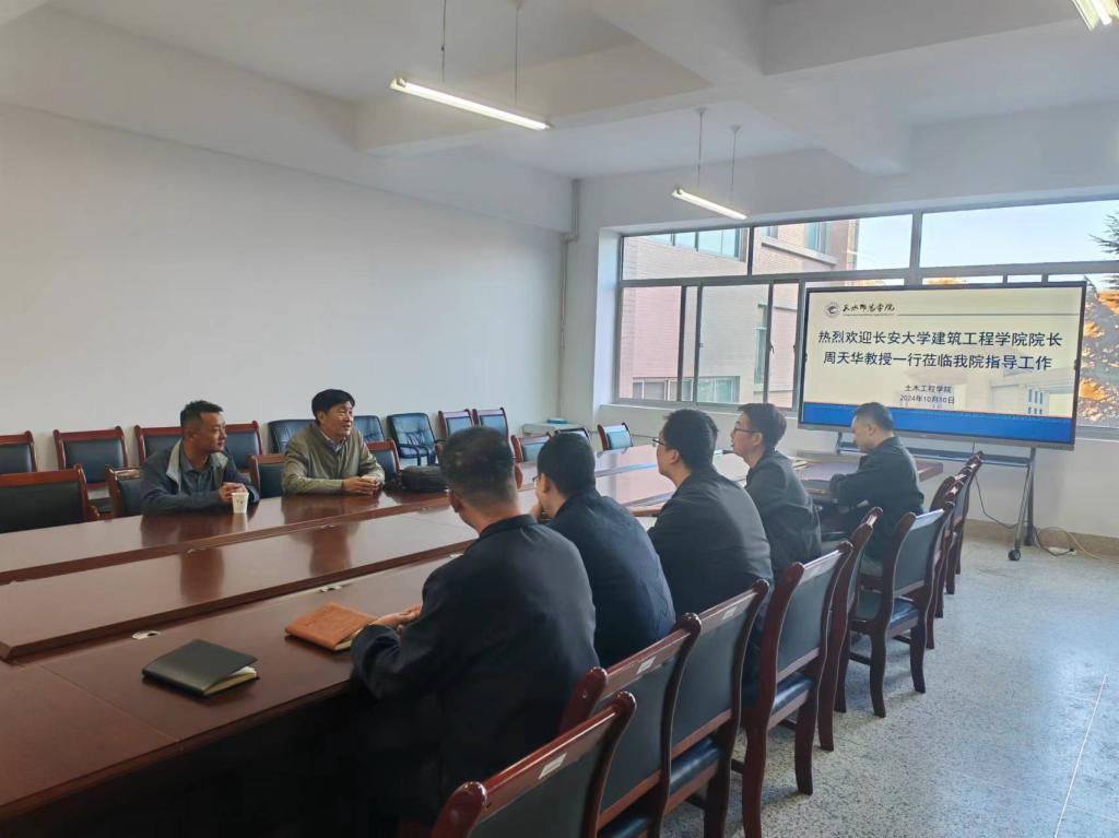 10月10日下午,长安大学建筑工程学院周天华教授一行来我院交流。土木工程学院院长吕向明、副院长魏国强、土木工程新技术应用研究所所长王鑫等教师陪同交流。